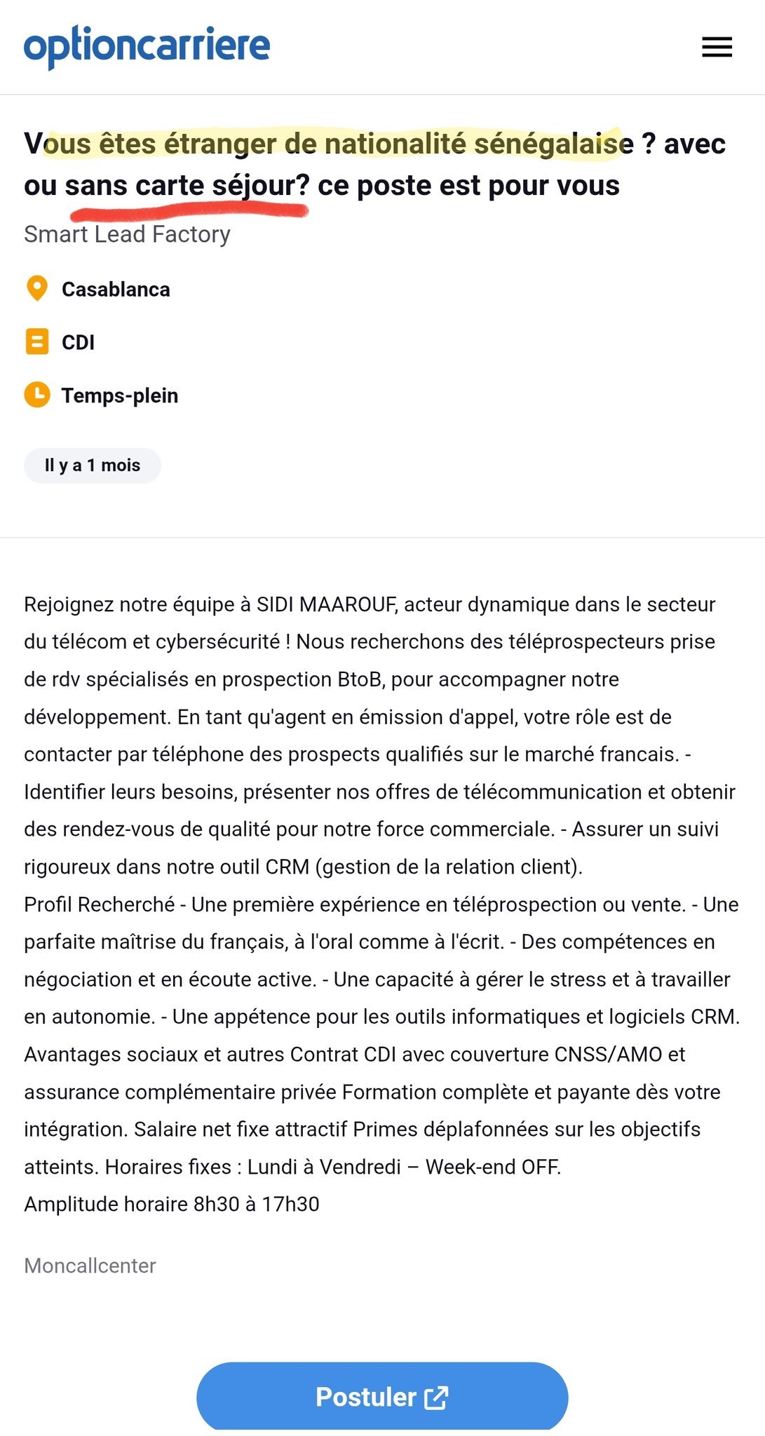 أثار إعلان توظيف منسوب إلى مركز للنداء بمنطقة سيدي معروف في الدار البيضاء. موجة تفاعل واسعة على منصات التواصل الاجتماعي، بعد تداوله على نطاق واسع. باعتباره عرضًا يقصر الترشح على حاملي الجنسية السنغالية دون غيرهم.