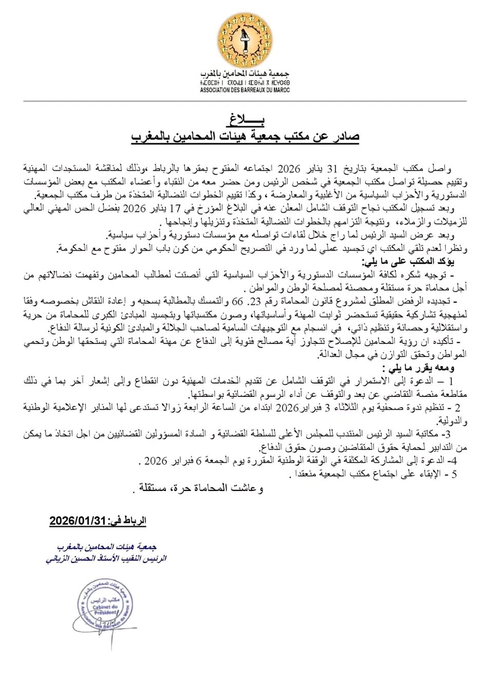 أعلنت جمعية هيئات المحامين بالمغرب مواصلة التوقف الشامل عن تقديم الخدمات المهنية، بما في ذلك مقاطعة منصة الأداء الإلكتروني للرسوم القضائية، إلى حين إشعار آخر، احتجاجا على المساس باستقلالية مهنة المحاماة ومكتسباتها الدستورية.