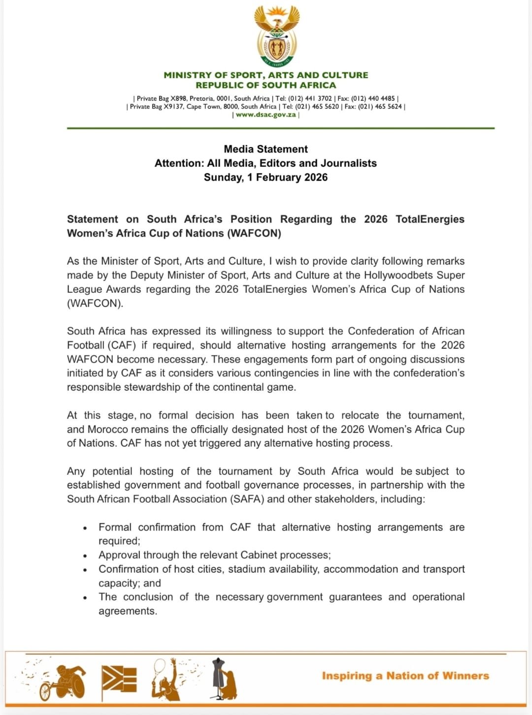 وشدد البلاغ على أن المغرب لا يزال الدولة المستضيفة رسميًا لكأس أمم إفريقيا للسيدات. ولم يتم اتخاذ أي قرار رسمي لنقلها. مؤكدا استعداد جنوب إفريقيا لدعم الاتحاد الإفريقي لكرة القدم إذا دعت الحاجة لإيجاد حلول بديلة. مع الالتزام بجميع الإجراءات الحكومية والاتحادية المعمول بها.